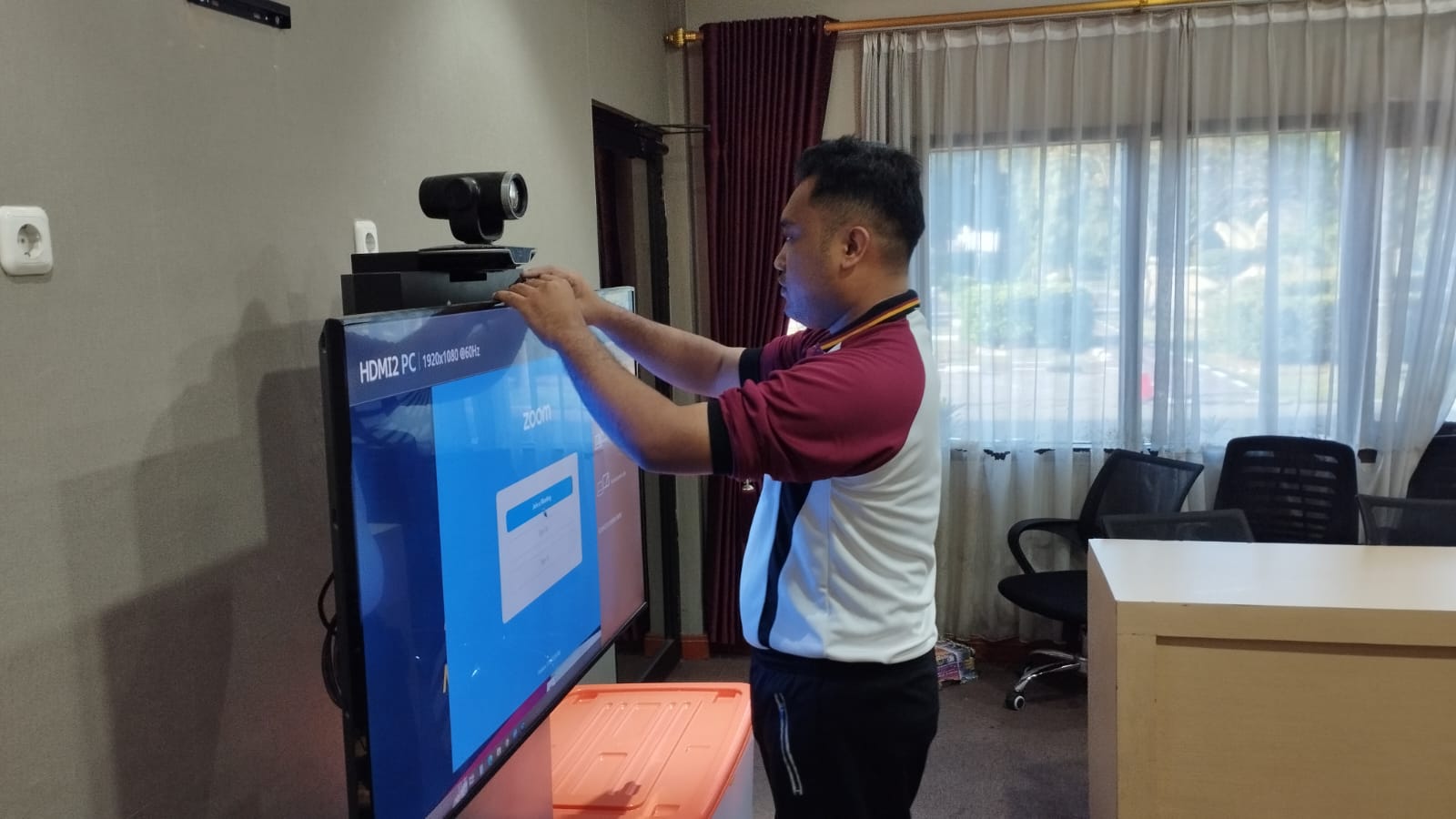 Anggota Tik Polres Cilegon Menyiapkan Sarana dan Prasarana Untuk Kegiatan Zoom meeting Dalam pelaksanaan kegiatan zoom meeting tersebut anggota TIK Polres Cilegon yang bertanggung jawab untuk menyiapkan peralatan zoom. Selain itu agar di tidak ada gangguan jaringan sebelum pelaksanaan anggota TIK melakukan pemeriksaan terhadap sarana dan prasarana tersebut . Satu jam sebelum kegiatan zoom meeting itu dimulai. Kapolres Cilegon AKBP. DR. MARTUA RAJA TARIPAR LAUT SILITONGA. melalui Kasi TIK IPTU Lukman menyampaikan bahwa “untuk menunjang kelancaran penyampaian informasi anggota TIk Polres Cilegon selalu memeriksa sarana dan prasarana tersebut, sebelum maupun pada saat pelaksanaan akan selalu di monitor