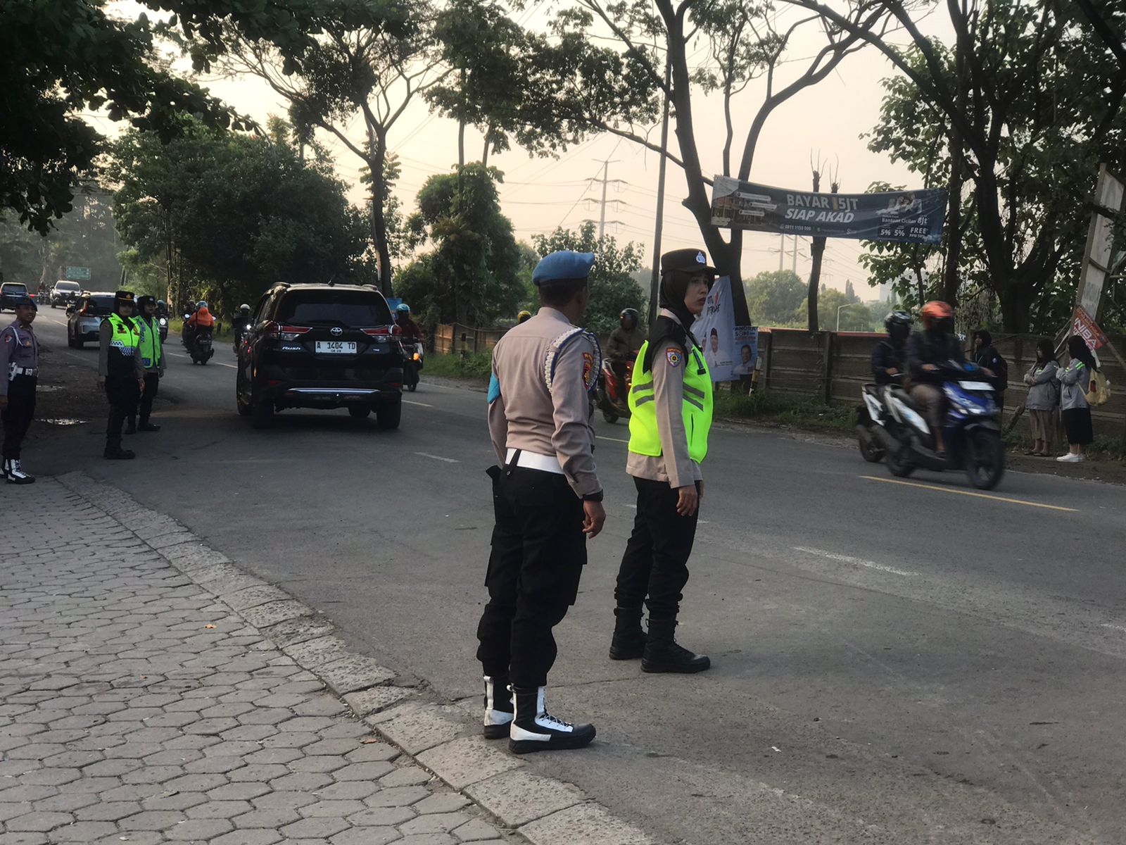 Cilegon,Polres Cilegon Polda Banten Pada Senin/06/10/2025 Pukul 06.30 Wib, Personil Siwas Polres Cilegon, Aipda Emi Prasetyo melaksanakan kegiatan pengaturan arus lalu lintas di Jalur Protokol jalan utama Kota Cilegon tepat nya di jalur depan perumahan arga baja Pura Kota Cilegon.