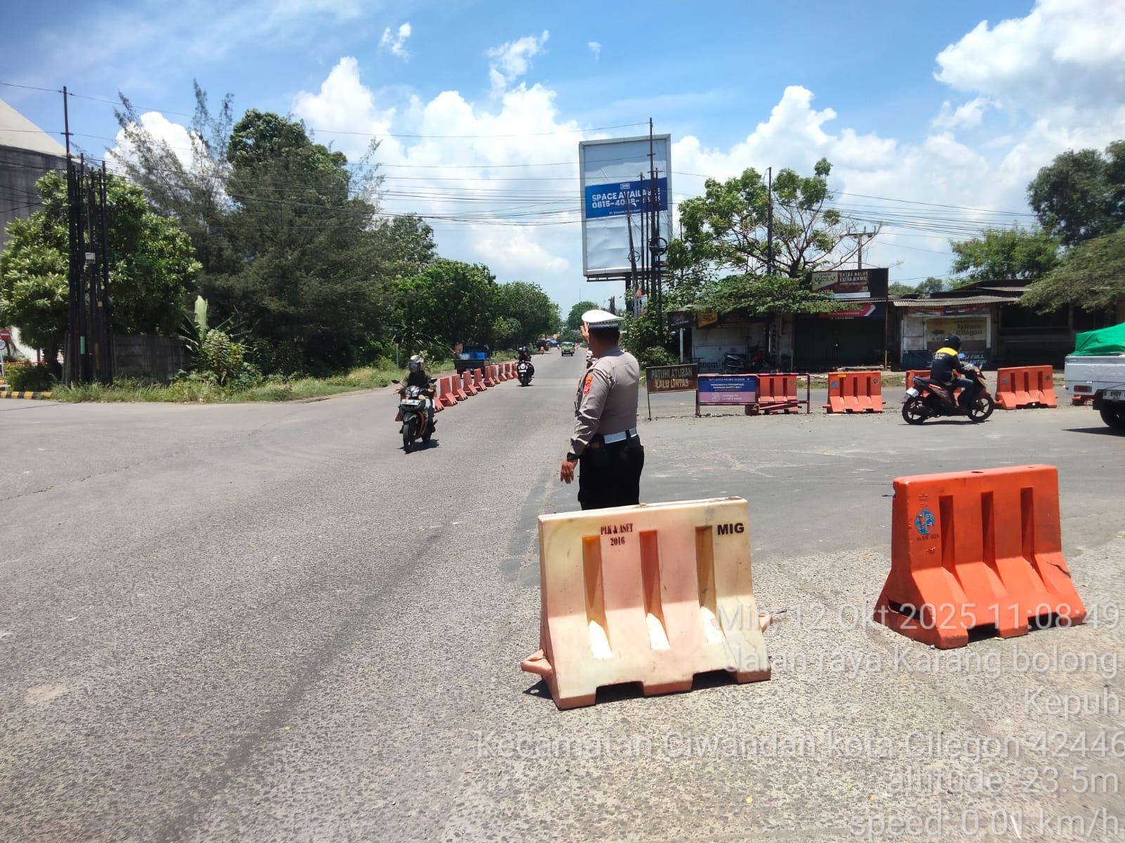 Cilegon - Personil Unit Lantas Polsek Ciwandan Polres Cilegon Polda Banten melaksanakan kegiatan monitoring jalur wisata di depan Pos Lantas JLS Ciwandan, Minggu, (12/10/2025).