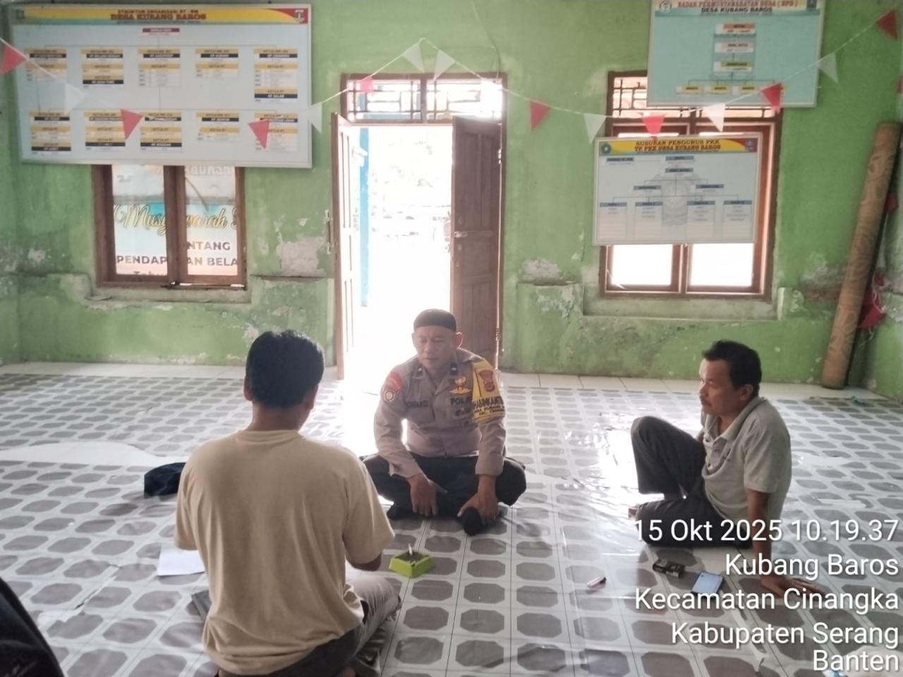 *CILEGON* dalam Rangka Mengantisipasi Gktm di wilayah Personil Bhabinkamtibmas Cinangka melakukan patroli Dialogis dengan Kepala Desa dan warga dan Menanyakan situasi Kamtibmas di wilayah dalam Rangka Menjaga Harkamtibmas di Desa Binaannya Kecamatan Cinangka Kab. Serang. Rabu (15/10/2025).