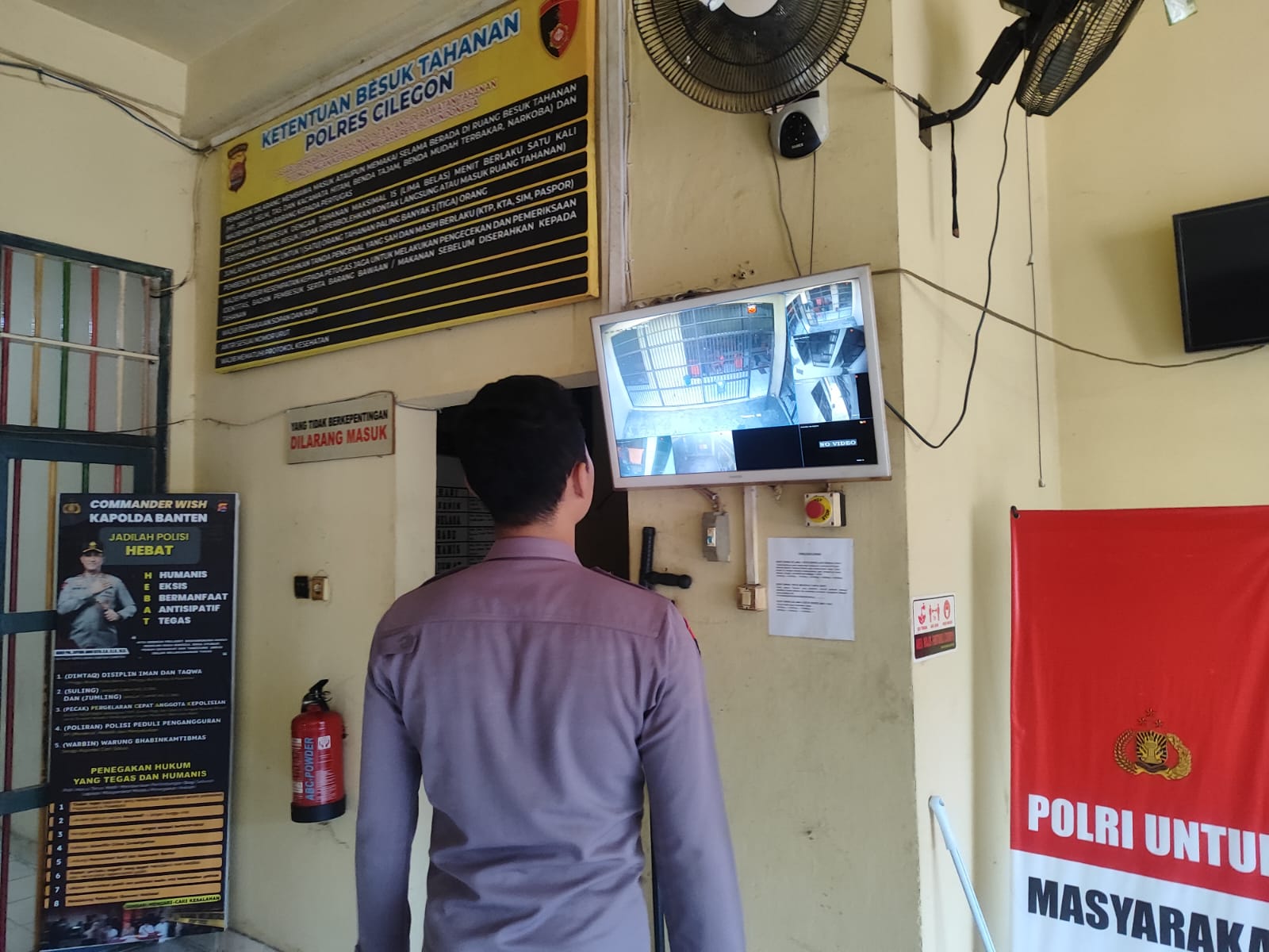 Personil Sat Tahti Cek Tahanan melalui CCTV yang ada di Rutan Polres Cilegon.