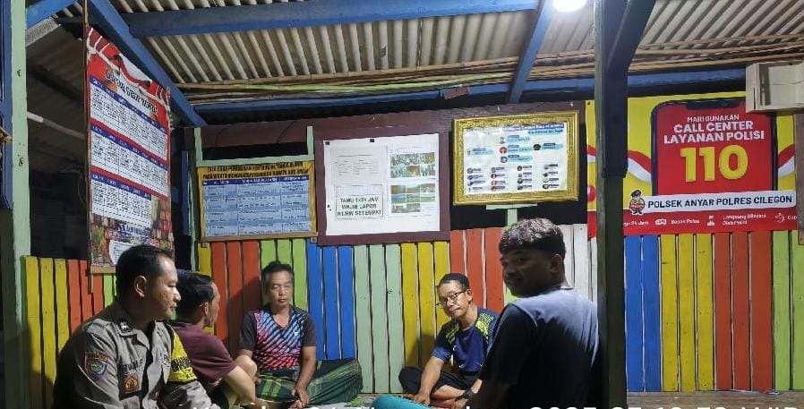 Cilegon - Personel Bhabinkamtibmas Polsek Anyar Polres Cilegon Polda Banten Aiptu Irvan melaksanakan sambang Ronda Siskamling Dalam rangka menjaga Harkamtibmas dan Sebagai bentuk mendukung Program Quick Wins Presisi Polri, Jum'at (07/10).