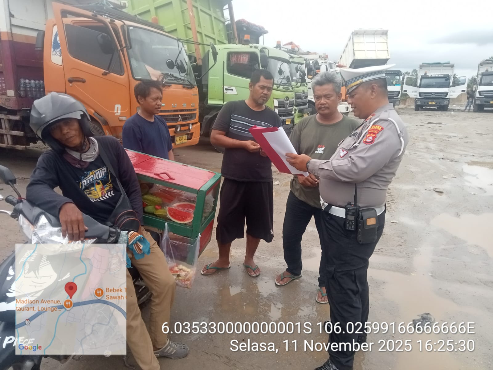 Cilegon - Panit Lantas Polsek Ciwandan IPTU Deni Mulyana dan Bhabinkamtibmas Kelurahan Tamanbaru AIPDA Ediyanto melaksanakan monitoring stokfile pasir di Lingkungan Kubang Lesung Pabuaran PT. Pamungkas Perkasa, Kelurahan Tamanbaru, Kecamatan Citangkil, Kota Cilegon, Selasa (11/11/2025).