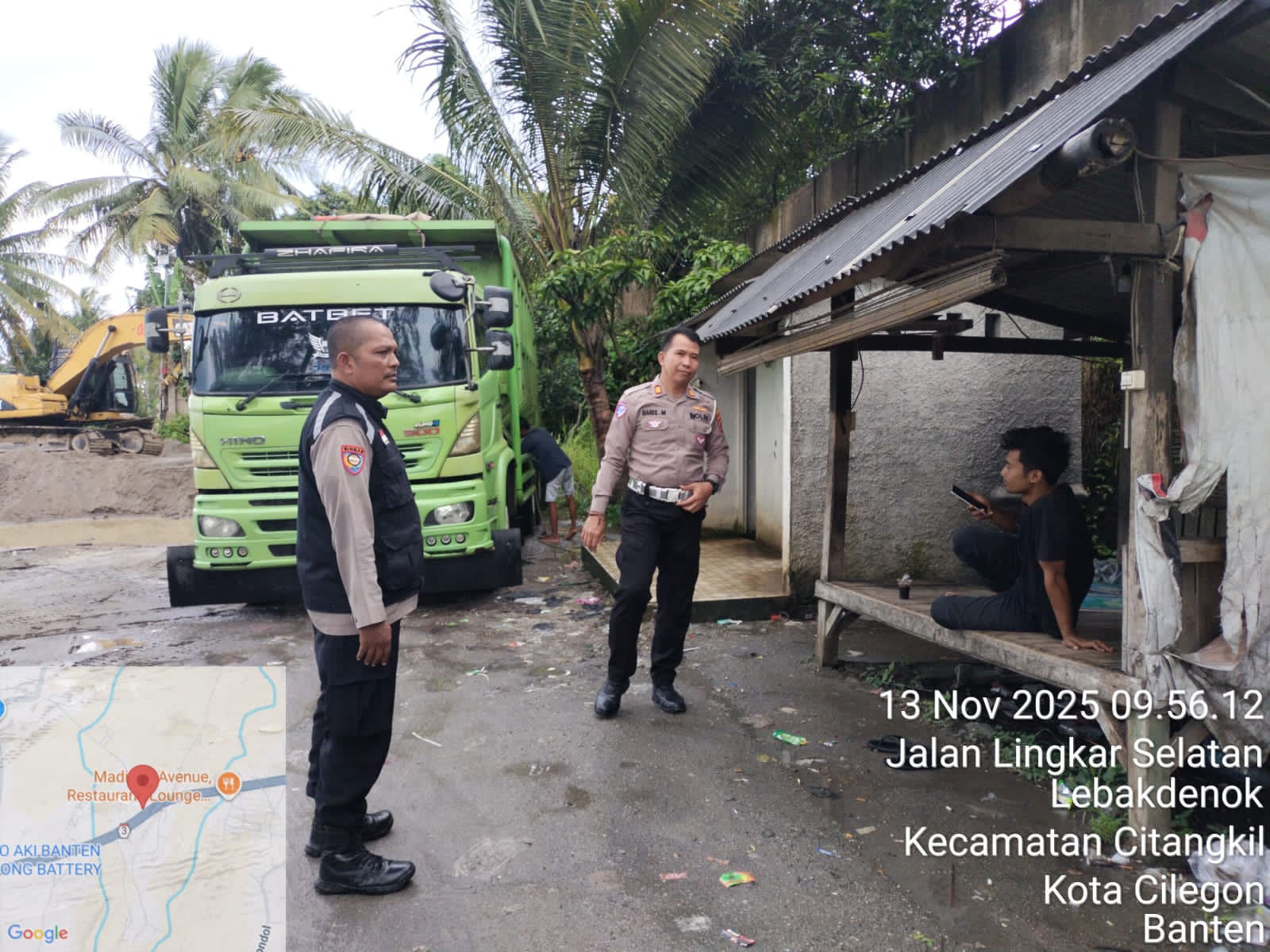 Cilegon - Kanit Lantas Polsek Ciwandan AKP Haris Munandar Bersama Bhabinkamtibmas Kelurahan Lebak Denok AIPTU Yudi Setiawan melaksanakan Himbauan SK Gubernur Dan monitoring stokfile pasir Didaerah hukum Polsek Ciwandan, Kamis (13/11/2025).