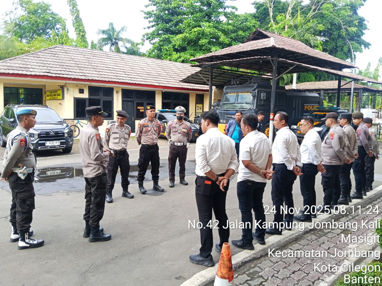 Cilegon, personel Satreskrim Polres Cilegon Polda Banten melaksanakan piket di penjagaan pintu masuk Polres Cilegon Polda Banten untuk memastikan mako Polres Cilegon dalam keadaan aman dan nyaman dalam melayani Masyarakat tanpa adanya gangguan kejahatan. Senin (24/11/2025).