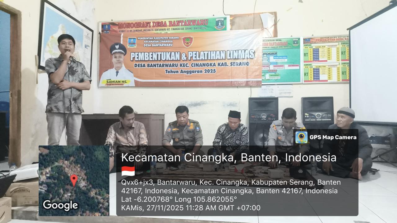*CILEGON* dalam Rangka Mengantisipasi Gktm di wilayah Personil Bhabinkamtibmas Cinangka melakukan patroli Dialogis dengan Kepala Desa dan warga dan Menanyakan situasi Kamtibmas di wilayah dalam Rangka Menjaga Harkamtibmas di Desa Binaannya Kecamatan Cinangka Kab. Serang. Kamis (27/11/2025).