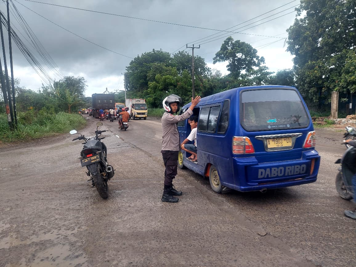 Strong Poin Sore Hari, Bripka Bambang Personil Polsek Bojonegara Laksanakan Pengaturan lalu lintas Di Jalan Raya PT Bam Bojonegara