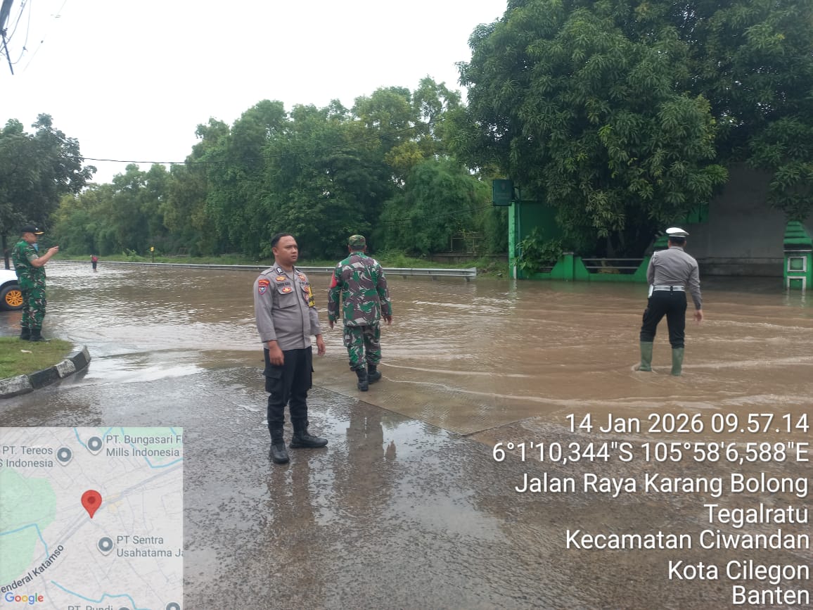 Cilegon - Personil Polsek Ciwandan melaksanakan monitoring genangan air dampak cuaca hujan lebat di wilayah hukum Polsek Ciwandan, Rabu (14/01/2026).