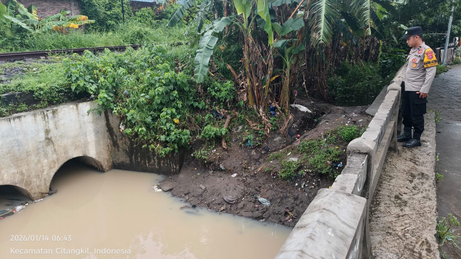 Cilegon - Dalam rangka antisipasi bencana alam personil Polsek ciwandan mengecek debit air di beberapa titik aliran sungai salah satunya yaitu kalimuk RT 005 RW 006 Kelurahan samang Raya Kecamatan citangkil Kota Cilegon, Rabu (14/01/2026).