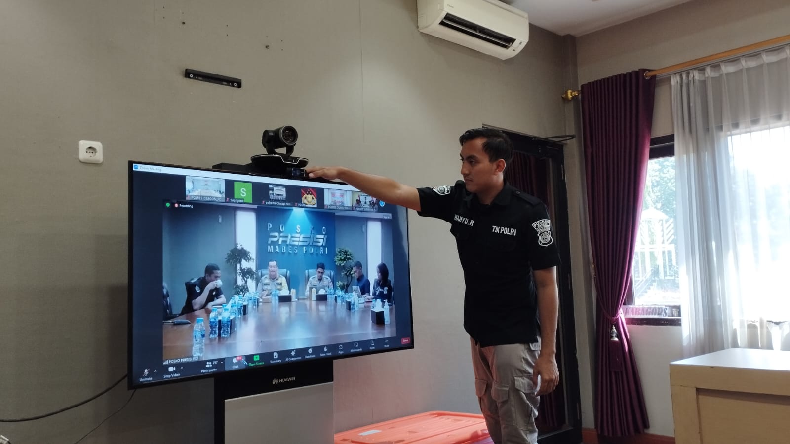 Anggota Tik Polres Cilegon Menyiapkan Sarana dan Prasarana Untuk Kegiatan Zoom meeting Dalam pelaksanaan kegiatan zoom meeting tersebut anggota TIK Polres Cilegon yang bertanggung jawab untuk menyiapkan peralatan zoom. Selain itu agar di tidak ada gangguan jaringan sebelum pelaksanaan anggota TIK melakukan pemeriksaan terhadap sarana dan prasarana tersebut . Satu jam sebelum kegiatan zoom meeting itu dimulai. Kapolres Cilegon AKBP. DR. MARTUA RAJA TARIPAR LAUT SILITONGA. melalui Kasi TIK AIPTU Suwanto, S.H. menyampaikan bahwa “untuk menunjang kelancaran penyampaian informasi anggota TIk Polres Cilegon selalu memeriksa sarana dan prasarana tersebut, sebelum maupun pada saat pelaksanaan akan selalu di monitor”