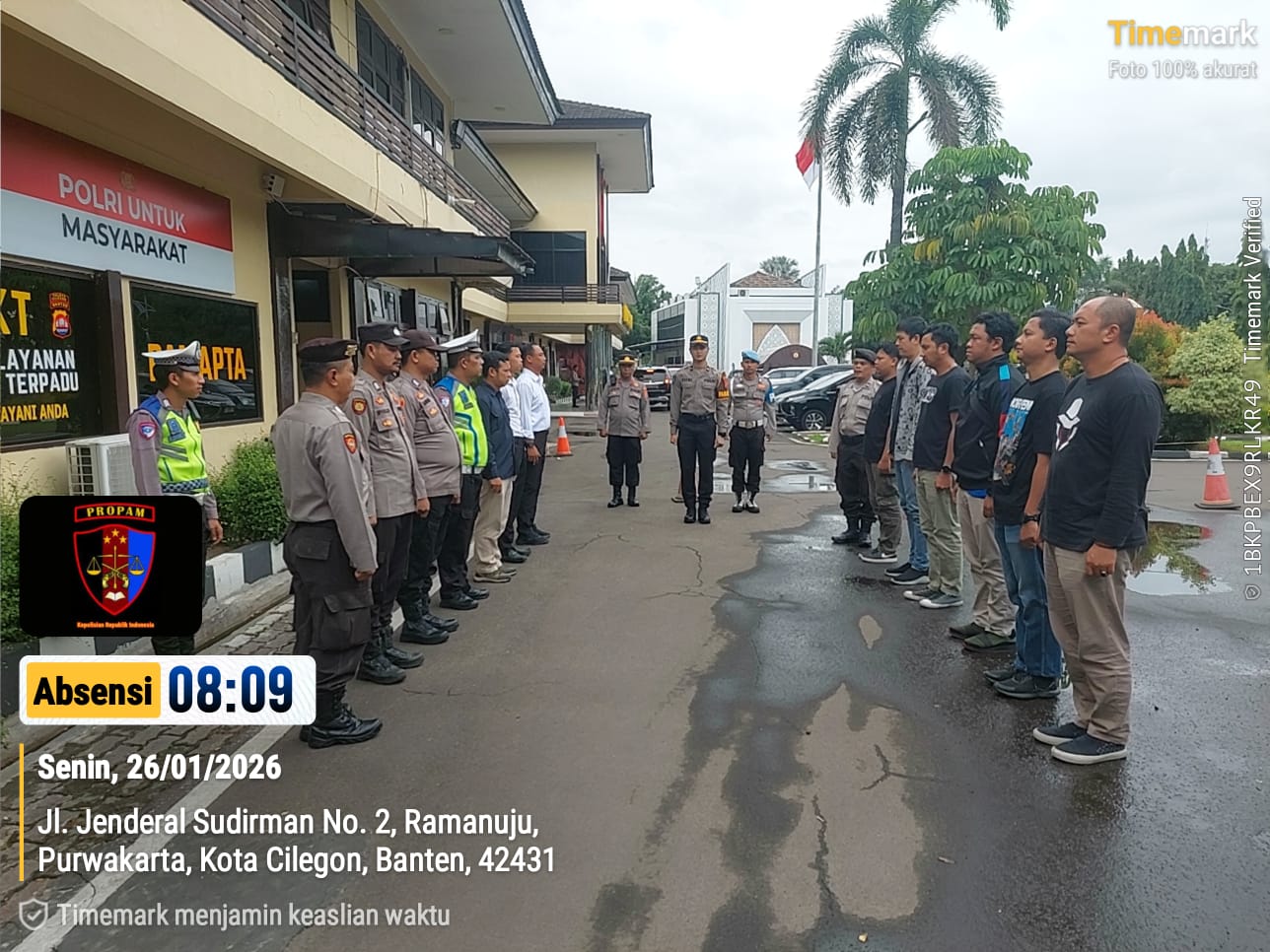 Cilegon, personel Satreskrim Polres Cilegon Polda Banten melaksanakan piket di penjagaan pintu masuk Polres Cilegon Polda Banten untuk memastikan mako Polres Cilegon dalam keadaan aman dan nyaman dalam melayani Masyarakat tanpa adanya gangguan kejahatan. Senin (26/01/2026).