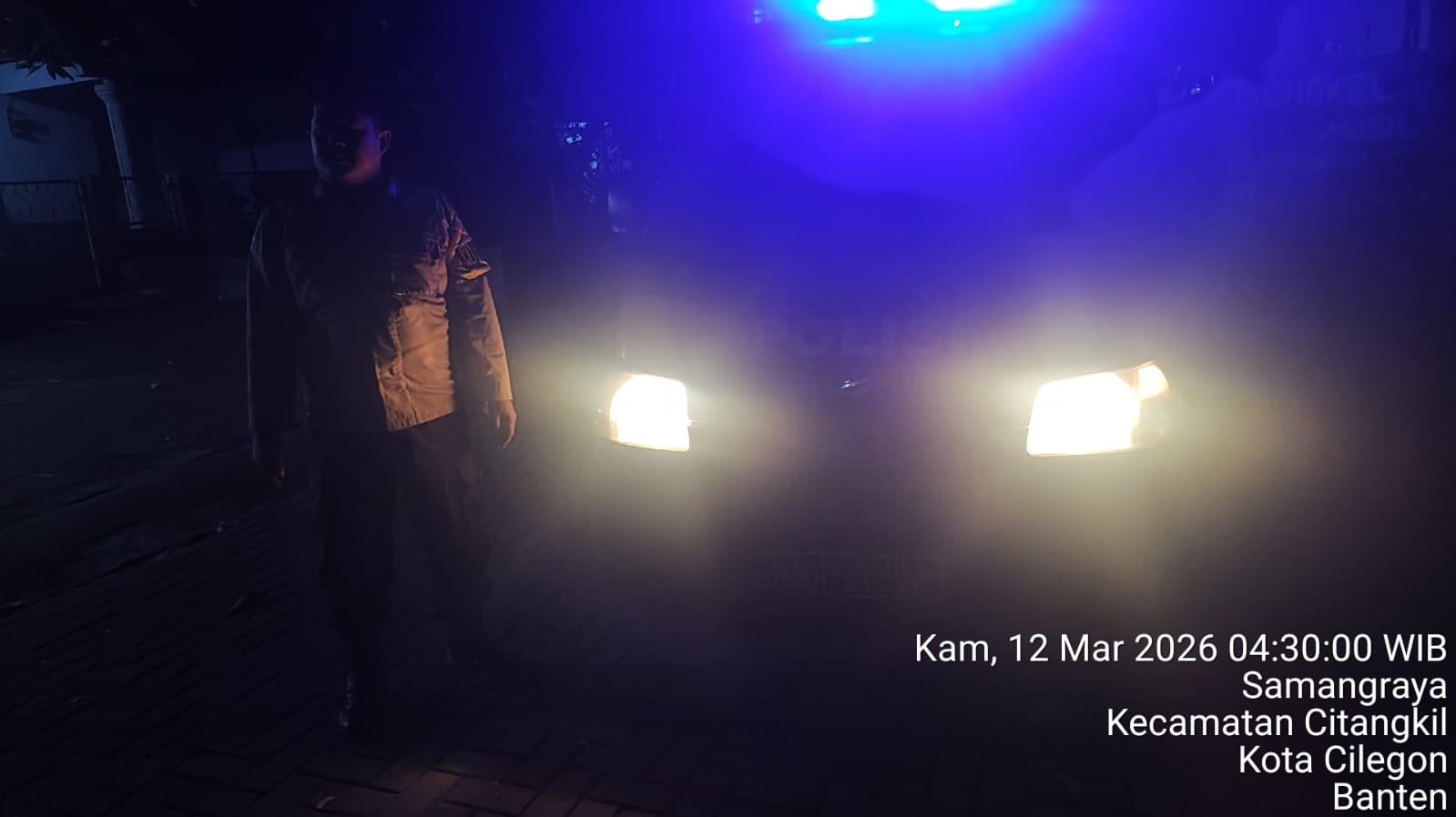 Cilegon - Personil Polsek Ciwandan Polres Cilegon Polda Banten Dalam Pelaksanaan Kegiatan Patroli dengan menyalakan lampu rotator berwarna biru di Daerah Hukum Polsek Ciwandan Polres Cilegon Polda Banten dari malam hingga dini hari, dalam rangka menciptakan situasi aman dan kondusif, Kamis (12/03/2026).