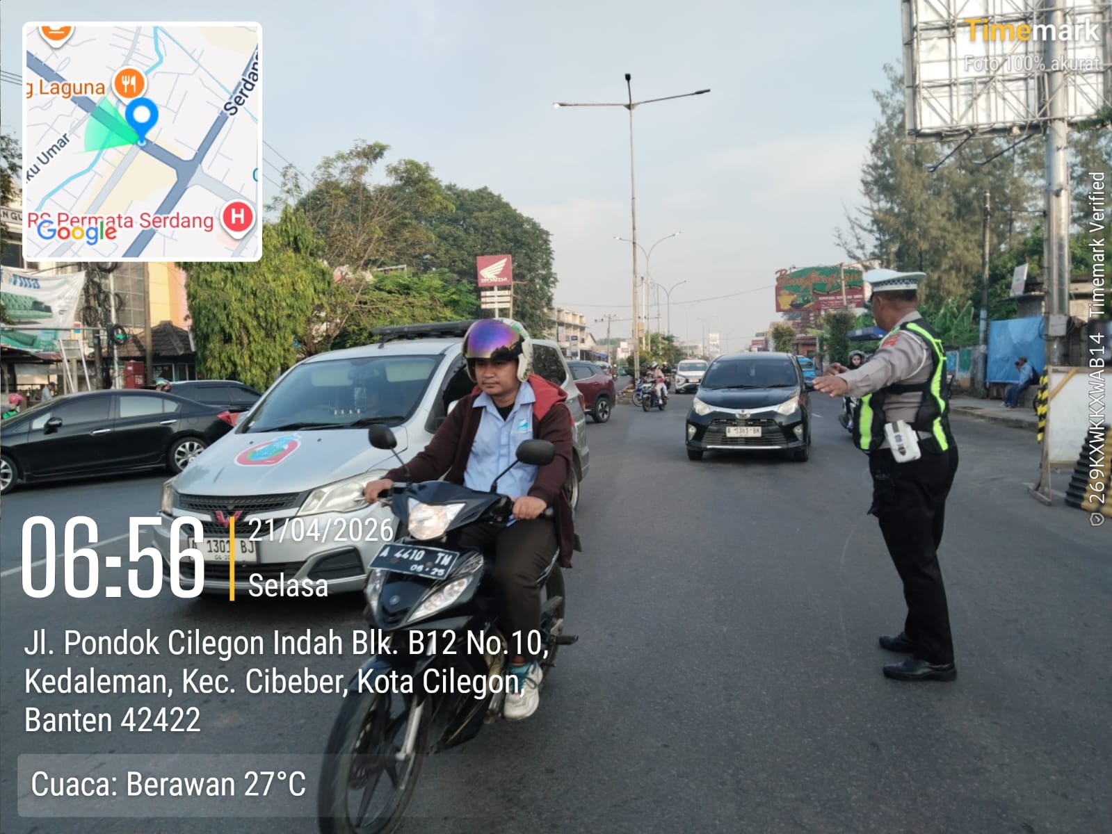 Cilegon – Polres Cilegon Polda Banten, Dalam Mewujudkan Aksi Nyata Pelayanan Kepada Masyarakat, Personil Satlantas Polres Cilegon Polda Banten Laksanakan PECAK (Pergelaran Cepat Anggota Kepolisian) Pengaturan Lalu lintas di wilayah perkotaaan terutama di titik rawan kemacetan dan kecelakaan lalu lintas, Selasa (21/04/2026).